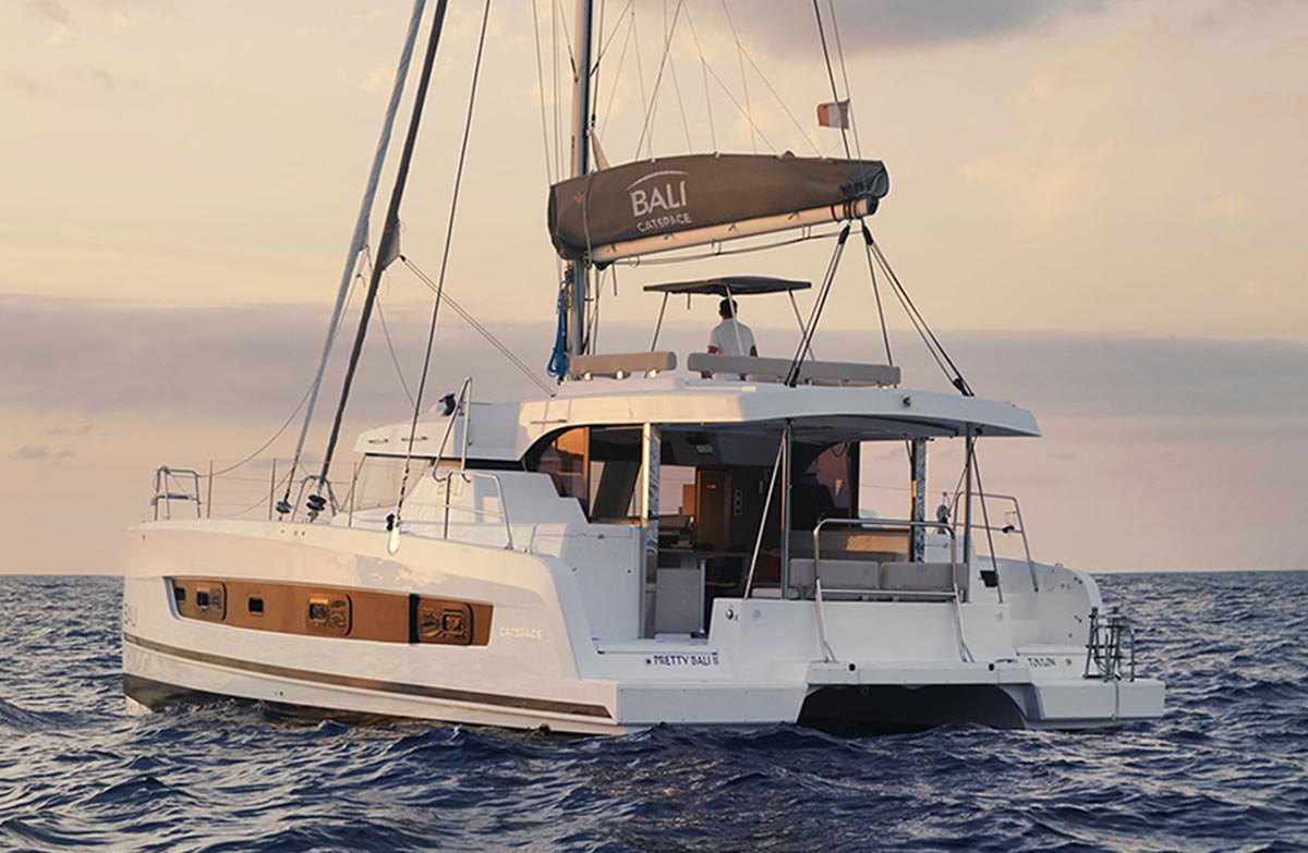 The CATSPACE is a 40-foot catamaran that combines all the innovations expected from a BALI. Her inverted bows, a signature element of models in the BALI range, offer a pronounced design. The integral deck allows for fluid circulation between the various spaces and ease of moving around while under way.