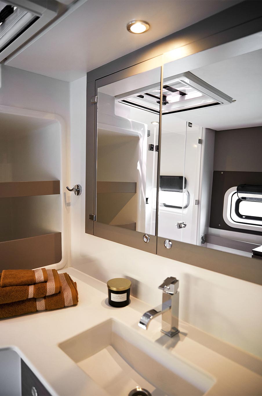 Rarely has a catamaran of this size offered such a habitable volume. The large tilt-and-turn door opens onto a truly impressive cockpit/saloon/galley area. Thanks to modern and refined materials, Lasta Design has succeeded in combining contemporary design, quality, and elegance. -