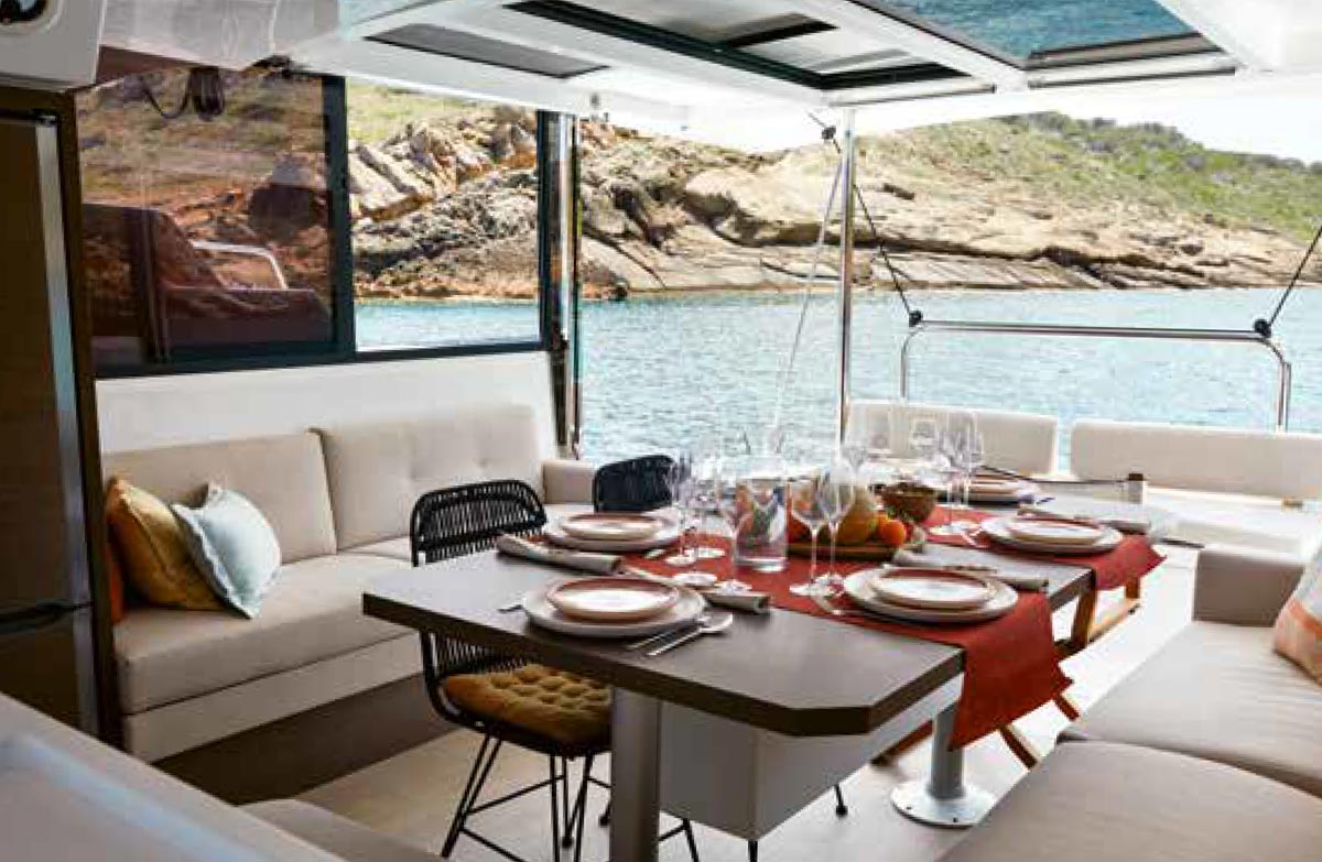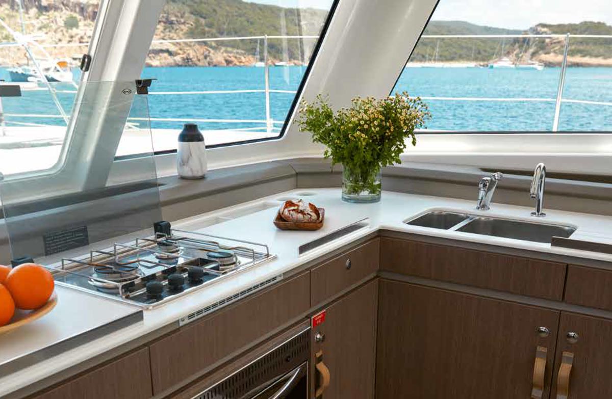 Rarely has a catamaran of this size offered such a habitable volume. The large tilt-and-turn door opens onto a truly impressive cockpit/saloon/galley area. Thanks to modern and refined materials, Lasta Design has succeeded in combining contemporary design, quality, and elegance. -